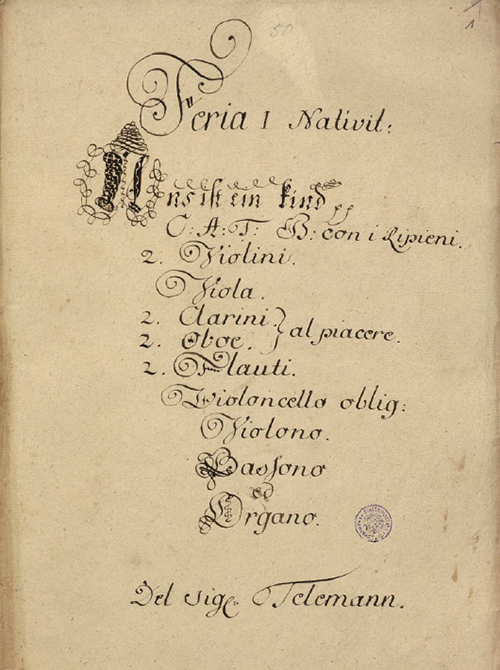 Abbildung: G. P. Telemann, Uns ist ein Kind geboren aus dem 1. Concerten-Jahrgang 1716/17 (TVWV 1:1450), niversitätsbibliothek Frankfurt am Main, Ms.Ff.Mus. 1414,